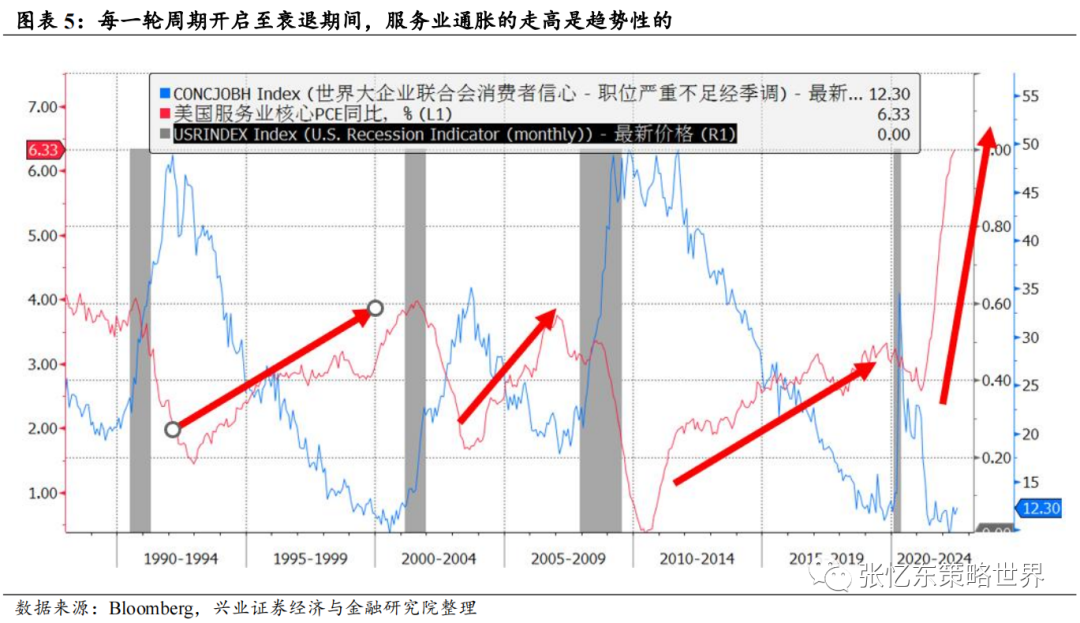 对美国整体通胀影响在增大的服务业通胀,以史为鉴,只有衰退才能使其明显降温。服务业通胀具备粘性,我们看到,90年代以来的经验是,美国核心PCE服务分项趋势性走高贯穿每一轮周期,只有衰退才能使其进入下行趋势。