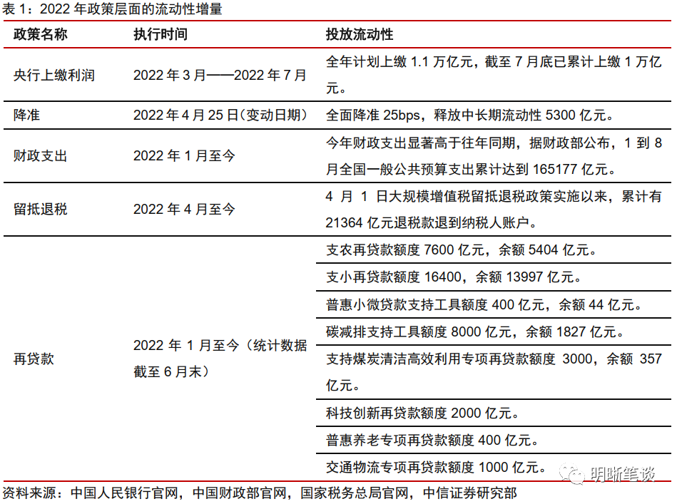 具体而言:(1)今年3月8日央行发布公告宣布今年将向财政部上缴超过1万亿元的结存利润,并透过财政支出的形式向市场提供流动性增量;参考二季度货币政策执行报告,截至7月底央行上缴利润已累计超过1万亿元,另一方面,留底退税等财政政策配合发力,截至8月15日已累计有21364亿元退税款退到纳税人账户,在结存利润上缴与留抵退税政策落实的背景下,今年财政支出力度显著大于往年同期。