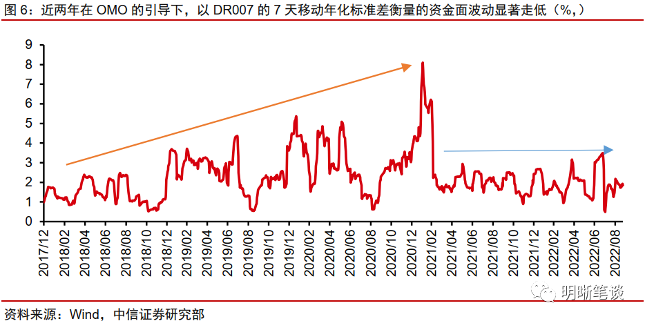 在央行富有前瞻性的公开市场操作指导下,近几年资金面的波动程度显著降低。参考DR007的7天移动年化的标准差,2020年底前一度走阔至8%附近,而在2021年与2022年基本已回落至2%,可见公开市场操作引导流动性市场趋于稳定的效果较为显著。