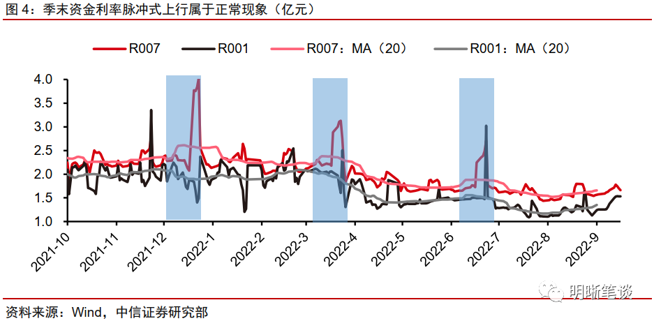 季末时点资金利率普遍存在上行压力,9月资金面波动符合市场规律,属于短期现象。季末时点由于存款类机构面临MPA考核而收紧银行间流动性供给,而市场流动性需求趋强,因而资金利率往往呈现季末宽幅上行,完成跨季后迅速回落的脉冲式调整特征。