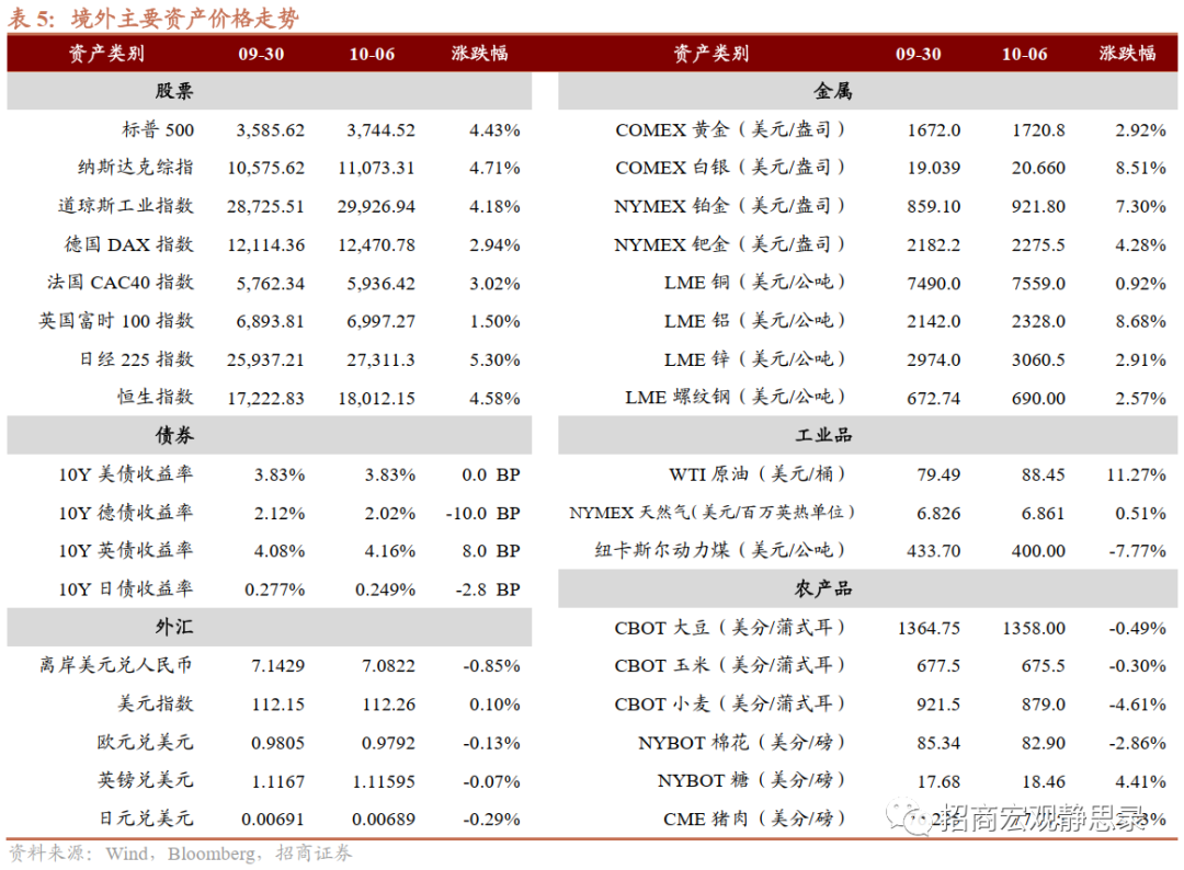 (4)能源因素继续助推欧元区通胀:9月欧元区调和CPI升至10%,预期9.7%;核心调和CPI同比4.8%,预期4.7%;均创历史新高。能源CPI同比40.8%为主要贡献项。