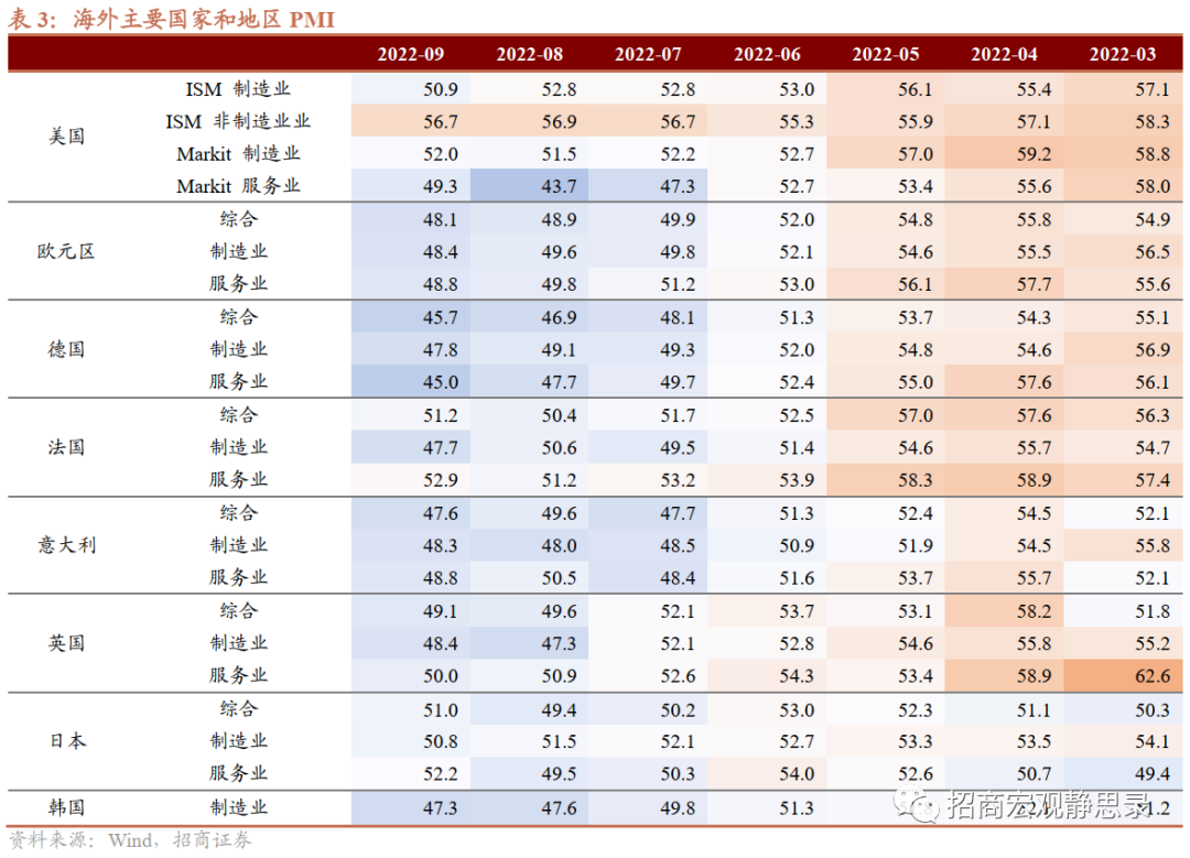 (3)海外各国PMI普遍不佳:美国9月ISM制造业指数降至50.9,为2020年6月以来最低值;欧元区9月综合PMI为48.1,连续第5个月下降,德国、意大利表现较差;日本PMI小幅回升;韩国制造业PMI下降。