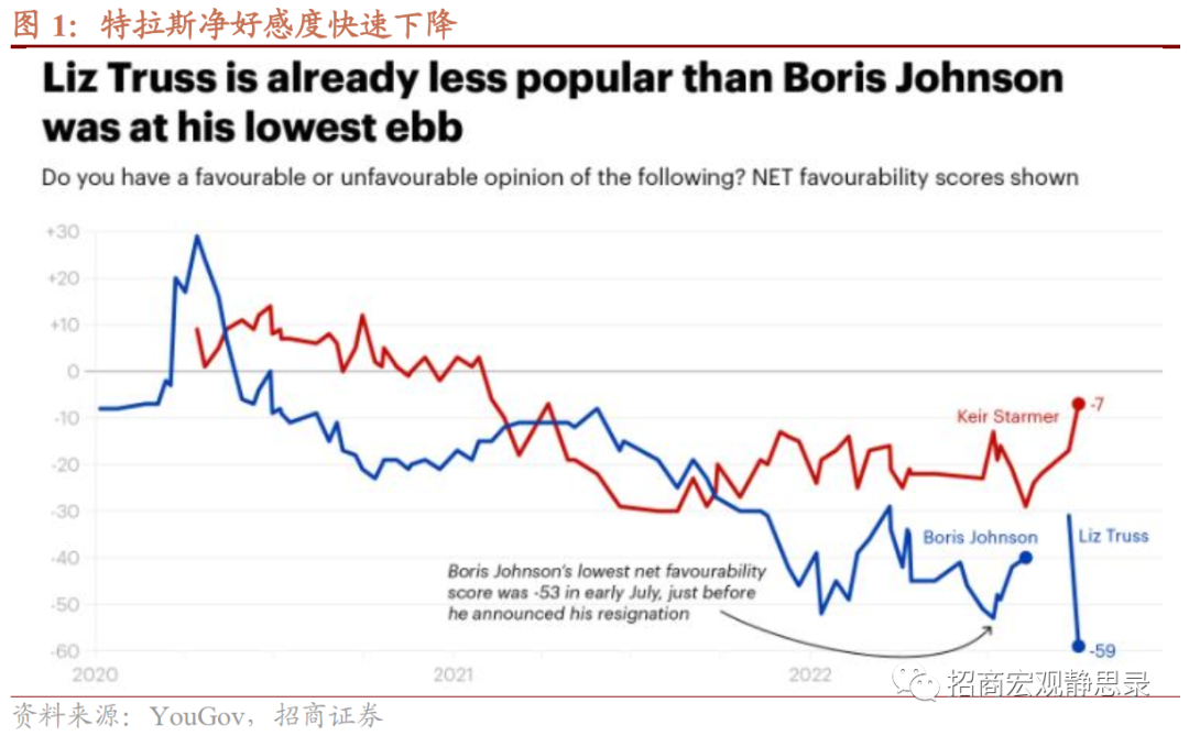 10月3日英国政府迫于市场巨震压力,宣布撤回此前大规模减税计划中的“将最高所得税税率从45%下调至40%”一项,此次转向距离先前提出的大规模减税计划仅过去10天。在10月1-2日进行的YouGov调查中,仅14%的民众对特拉斯“有好感”,73%的民众对特拉斯“看法负面”,因此特拉斯的净好感度(支持率-反对率)已降至-59%,低于约翰逊(-53%)和科尔宾(-55%)执政期内最低点。10月5日惠誉将英国政府和英国央行评级展望由“稳定”下调至“负面”,评级确认为“AA-”,并表示“大规模且无资金支持的减税计划或导致财政赤字激增”。