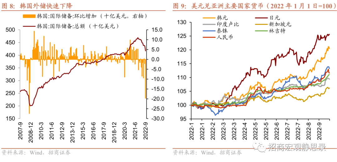 (5)韩国外储快速下降:9月韩国外汇储备环比减少196.6亿美元,单月缩水规模仅次于2008年10月,为历史上第二。主要原因为外汇部门为阻止韩元继续贬值而采取干预措施。