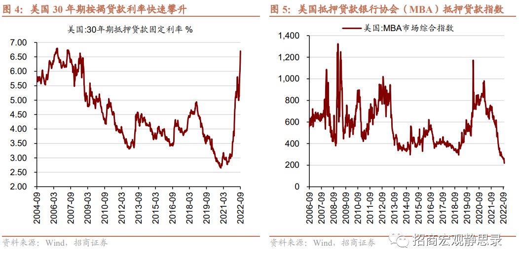 (2)美国抵押贷款利率继续攀升,地产数据或进一步转差:9月底30年期抵押贷款固定利率升至6.70%,达到2007年8月以来的最高值。抵押贷款市场指数创历史新低。