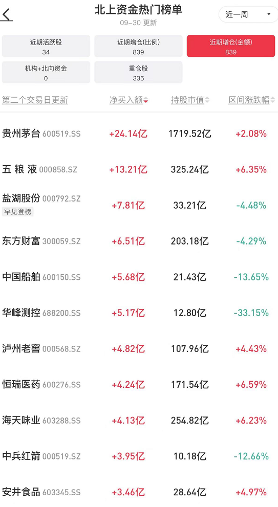 增仓金额上,北上资金上周斥资近20亿元净买入贵州茅台,并且还买入五粮液逾14亿元,高居上周净买入的前两位。