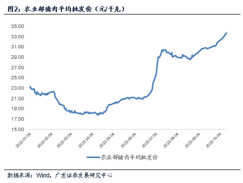 从农业部猪肉平均批发价观测,3月下旬之前震荡下行,3月22日至17.99元/公斤;3月下旬至4月下旬在18元/公斤左右徘徊;4月下旬后进入第一波上行,5月31日至21.2元/公斤。6月下旬起,猪肉价格进入第二波上行,7月12日升至30元/公斤以上;8月下旬以来,猪肉价格进入第三波上行,10月13日最新价格为33.8元/公斤。