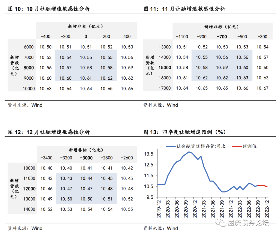 综合来看,四季度社融在信贷和非标方面仍有支撑,政府债是主要拖累。以上各项预测可能均有一定误差,我们将社融增速对信贷预测结果和非标预测结果做敏感性分析,预计10-12月社融存量增速分别为10.6%、10.6%、10.5%左右。所以四季度宽信用未必能至,但稳信用概率仍高,对债市而言就难有利多支撑。