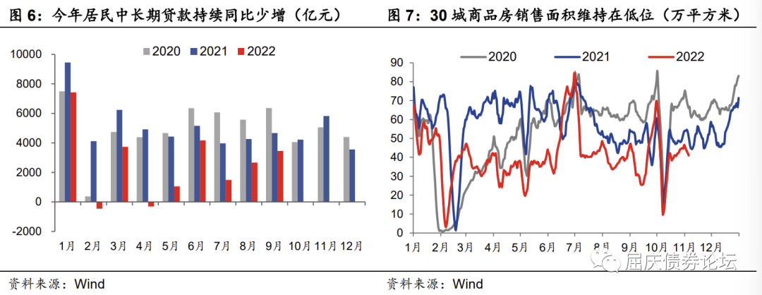 8月以来新一轮房地产放松和支持政策升温,包括2000亿元保交楼专项借款、调降5年期LPR、房贷利率下限、公积金贷款利率、放宽购房资格等等,但地产销售依旧疲弱,8-9月商品房销售面积同比跌幅分别为19.9%和14.2%,10月30城商品房成交面积同比跌幅在18.0%。地产景气度低位徘徊导致相应贷款需求不足,今年前三季度,房地产人民币贷款同比少增21812亿元,居民中长期贷款同比少增24000亿元,成为信贷的重要拖累。
