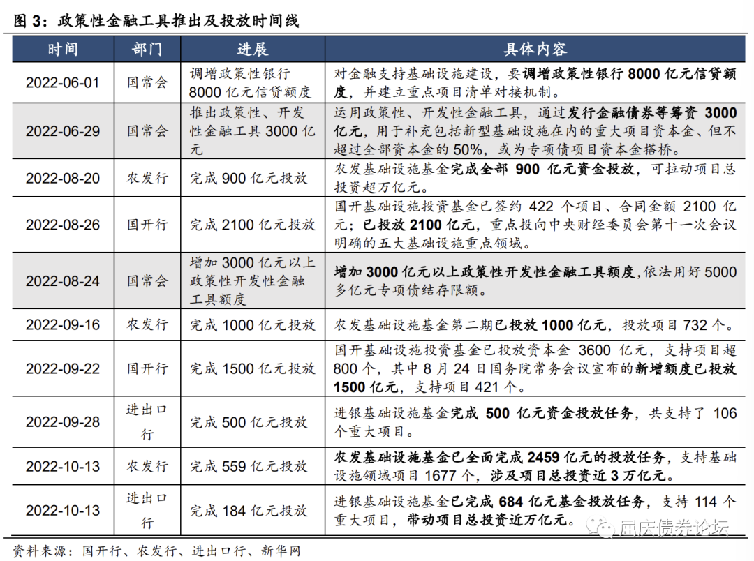8月24日,国常会提出“增加3000亿元以上政策性开发性金融工具额度”。第二批政策性金融工具在10月13日基本投放完毕,共计3743亿元,其中农发行、国开行、进出口行在9月分别投放1000亿元、1500亿元和500亿元,共计3000亿元;10月农发行和进出口行又分别再投放了559亿元和184亿元。