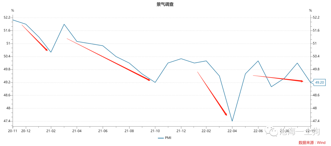 如下图所示,中国的PMI自2020年11月见顶之后,持续回落,2022年的情况比2021年更差,甚至PMI保持在荣枯线之上都有些困难。