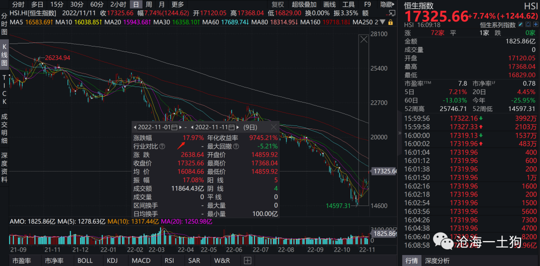 当然,最爽的情况是三击——中国、联储和非美一起共振,11月11日的行情就是一次小型的预演。恒生科技这10%+把很多人都吓坏了,怕不可持续。