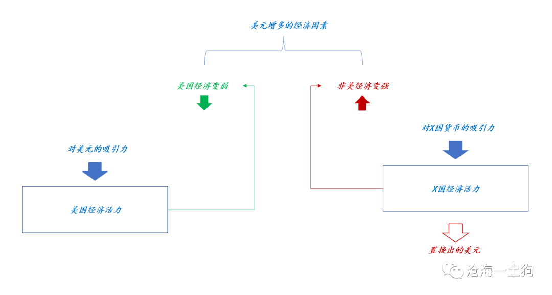 具体来说,如果X国经济太弱,其经济体(ps:把经济体想象成海绵)会减少对本国货币的吸附力,导致本地美元需求增加。