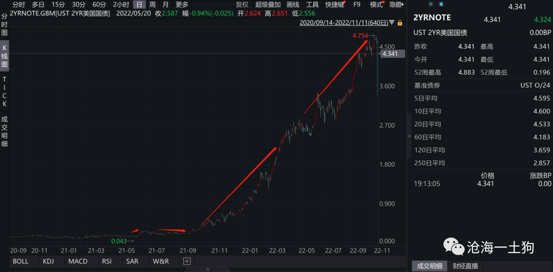 如下图所示,两年美债收益率从2021年6月份才开始启动,之后越来越高,一度超过了4.7%。两年美债收益率忠实地反馈了美国这一轮加息进程。(ps:参考《如何用两年美债跟踪市场的加息预期?》一文)