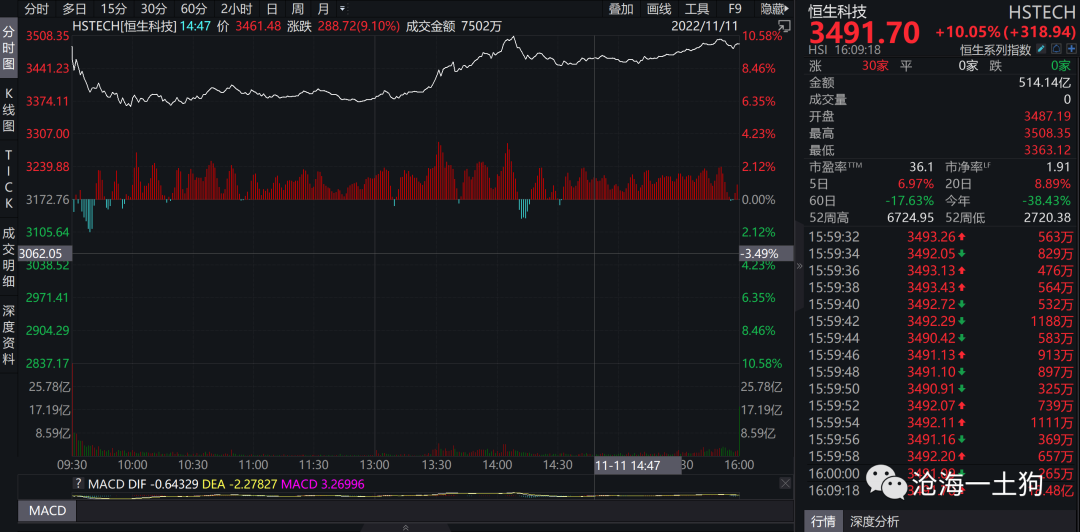 早盘恒生科技指数因为美国方面的利好大幅高开10%,之后回落至6%+的水准;下午又因为中国方面的利好,再次飚了上去,最后稳稳地涨了10%+。