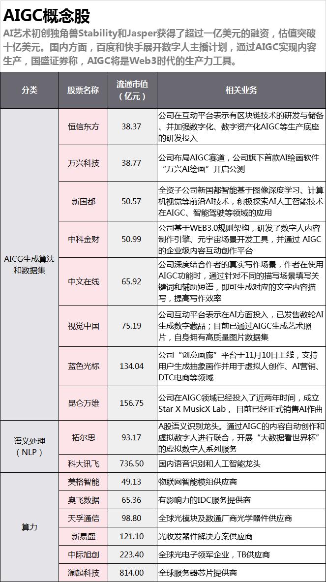 国盛证券指出,AIGC技术主要涉及两个方面,自然语言处理NLP和AIGC生成算法,AIGC投资方向主要包括软硬件与数据集。
