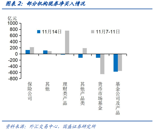从机构行为来看,大跌市场中直接卖出的主要是公募基金,而并非理财。从11月14日大跌当天各类机构现券减持规模看,公募基金是最主要的卖出者,利率债和信用债都是如此。11月14日公募基金减持国债现券58亿元,减持政金债264亿元,合计减持利率债330亿元,减持信用债60亿元,合计减持各类债券575亿元,是最主要的减持机构。公募基金不仅在大跌当天大幅卖出,上周也是主要的卖出者,上周公募基金累计净减持现券552亿元。而理财卖出规模相对有限,11月14日理财合计减持各类债券20亿元,相对于公募卖出规模非常有限,并非卖出主力。从减持券种来看,小幅减持信用债和利率债,而小幅增持存单27亿元。而上周银行理财净买入债券758亿元,显示理财并未大幅减持债券。同时,对存单来说,货基和公募基金同样是主要的减持者,两者分别在11月14日净卖出存单77亿元和66亿元,在上周货基更是大幅减持798亿元存单。