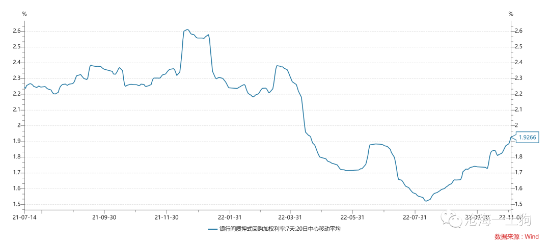 经过长时间的缓慢爬升,实际操作利率的20日中心移动攀升至1.93%,仅仅小幅偏离正常区间的下限——2.0%。