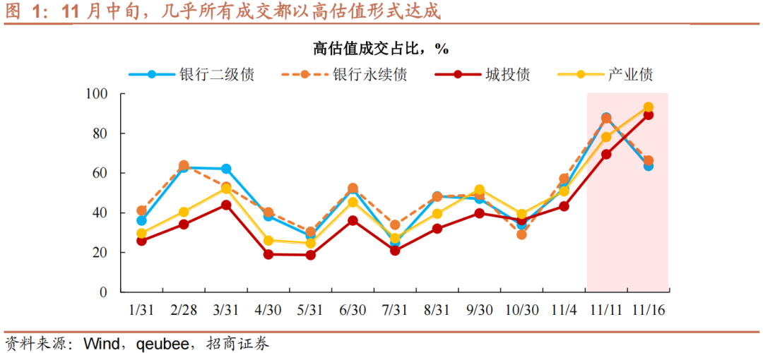 意料之外的是,这一防御力度是远不足够的。10月开始,资金中枢上抬,顺势带动存单收益,而防疫政策优化与地产行业纾困政策密集出台,无疑进一步撼动了债市投资者的信心。11月以来,10年国债估值收益上行幅度近19bp,票息资产更是在近期出现了罕见的流动性践踏,两点证据得以说明:第一,折价成交惊人。一方面,流动性偏弱的城投债和产业债,90%左右的交易都以折价形式达成。另一方面,11月14日开始,1年期以内票息资产成交与估值平均差值骤升至15bp以上(截至11月16日),包括证券次级债和保险公司债等都出现“砸盘”。要知道8月至10月,债市抢配才是主流,低估值配置是常态。