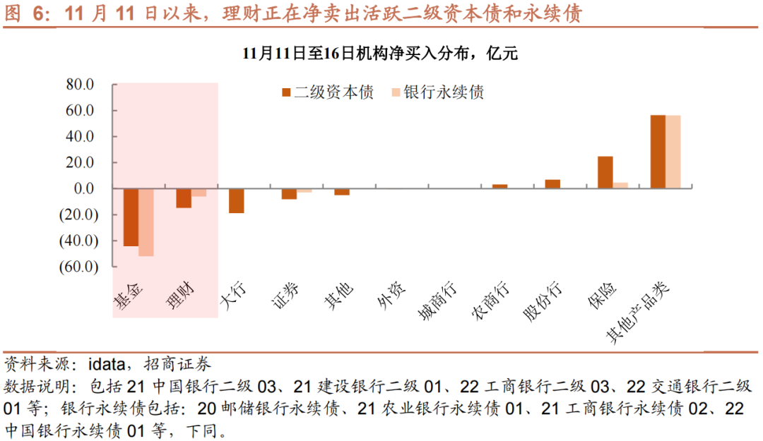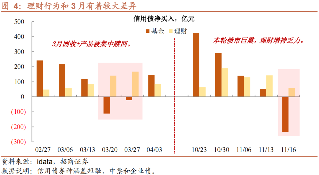 第一,理财净买入力度,本轮偏弱。2月至3月,权益资产过快下跌,导致不少固收+产品踩到回撤线,而相关产品开放期又集中在同一时间段。因此,一是出于止损的考虑,二是防范自身负债端波动,理财不得不选择赎回固收+基金。不过,从当时理财净买入信用债的情况来看,3月下旬依旧维持在较高水平,加上新增产品恢复,有效缓释负债端压力。而11月14日以来,基金大规模抛售时期,理财配置虽有,但幅度不及3月,加上近期理财子公司新发产品受阻,及中小行理财控存量,当前负债端压力或超3月。