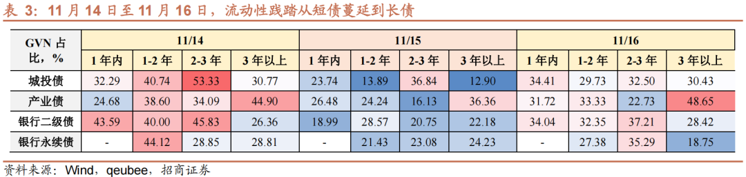 第二,急于变现资产。折价交易潮中,不同券种GVN成交笔数占总成交的比例远超年内其他时间表现。并且,出现两点恐慌蔓延的特征:一是期限偏长的非金融信用债面临的压力更大,3年期以上产业债成交平均GVN比例达到44%;二是历经两天调整,11月16日仍有大范围“甩卖”的迹象。这意味着什么?GVN达成交易意味着接受买盘报价,目前情况反映两点信息:一是出券的机构有急售诉求,这不是单纯看空后市,更合理的解释是账户被赎回所致;二是市场买盘稀少,上演流动性踩踏。