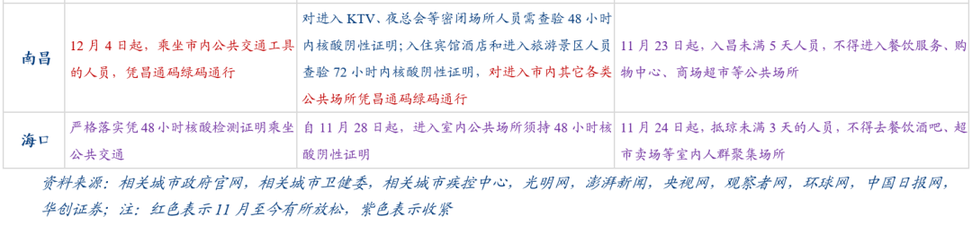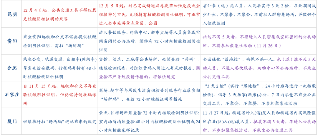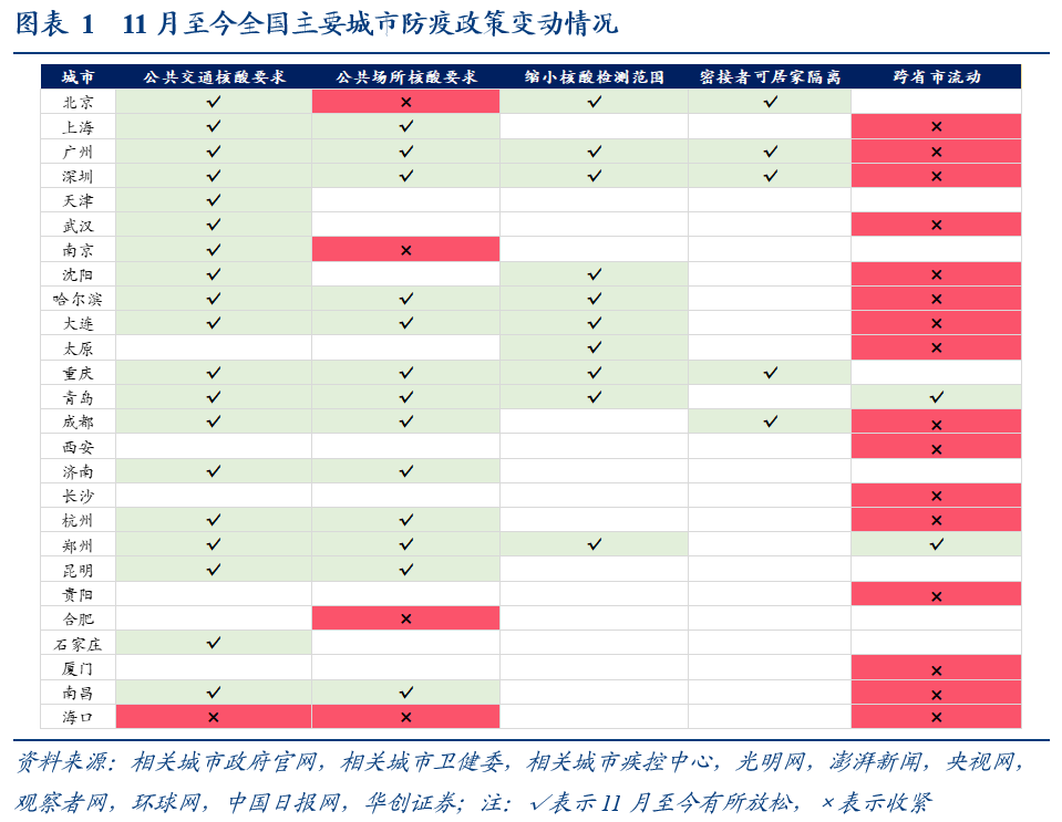 我们统计了全国26个主要城市11月至今防疫政策的调整情况,其边际变化主要在体现在5方面(具体见图表1-2)。