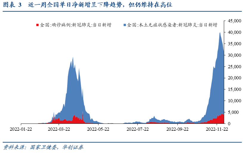 全国单日平均净新增呈下降趋势,但仍维持在3万例以上的高位。近6日新增病例数持续下降,从11月27日的高峰值3.88万例降至12月3日的3.09万例,主要是广东、重庆两地近期报告病例数大幅减少。但全国单日净新增连续10天维持在3万例以上。