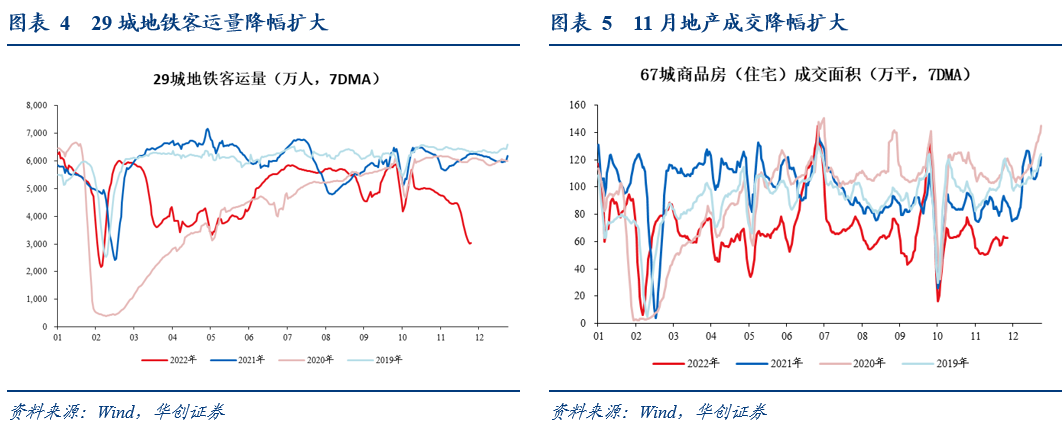 消费:11月全月,29城地铁客运量平均为4154万人,同比-30.5%。10月全月同比为-21.0%,9月全月同比为-13.5%。11月地铁出行降幅扩大,主要系北京、广州、重庆、石家庄等城市受疫情影响,其中北京出行量同比下降4成,广州、重庆等下降约7成。