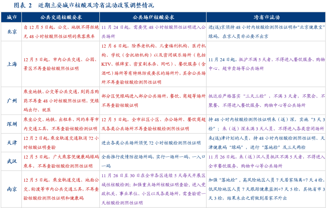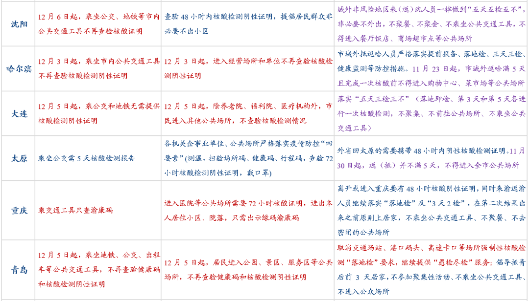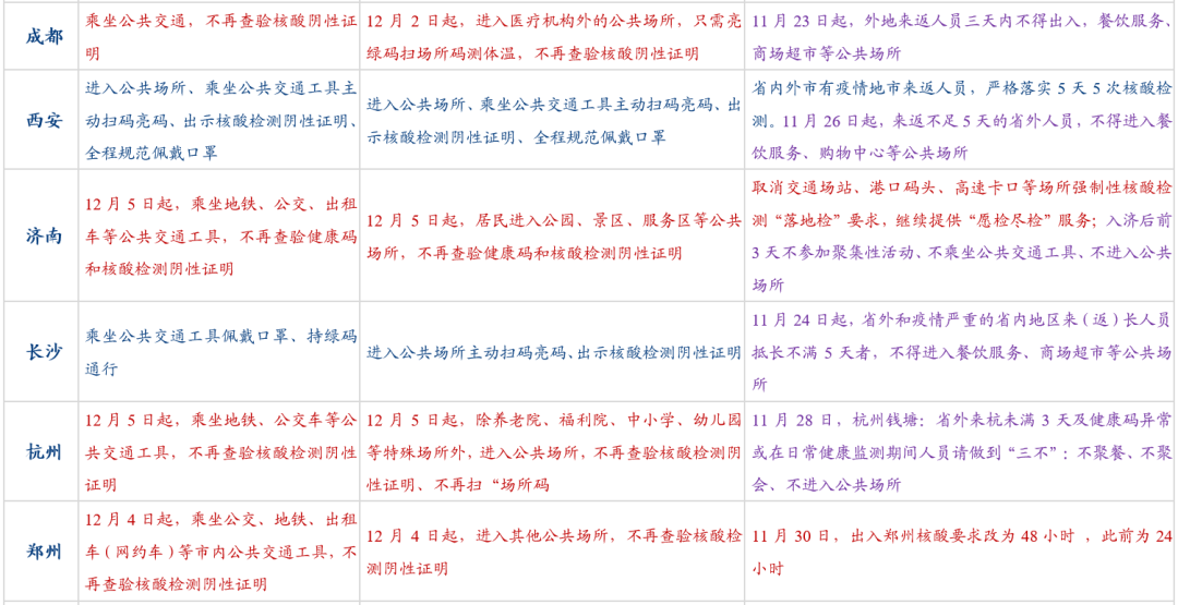 (二)变化二:公共交通对核酸的要求。26个城市中,有19个城市陆续取消乘坐公交、地铁的核酸查验要求,仅12月4日晚-12月5日,就有上海、山东(青岛、济南)、大连、郑州、武汉、杭州、南京、沈阳等9个城市先后发布取消公共交通核酸要求的通知。