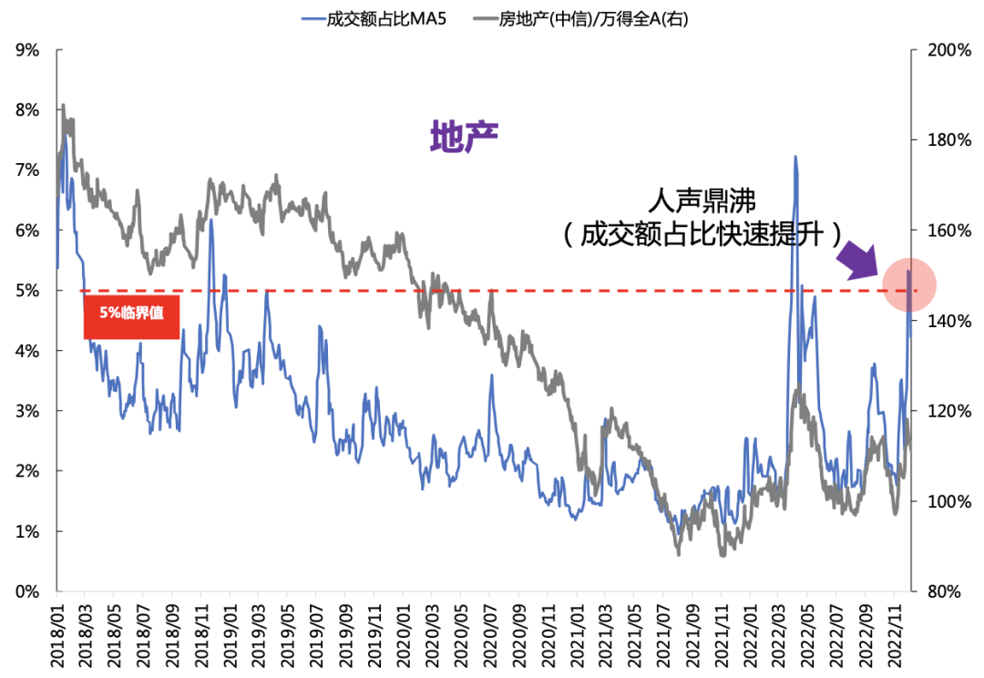 回到当前,一些板块又来到了【人声鼎沸】的位置,比如11月以来大涨的地产板块,从上周开始,成交额占比快速提升,对于短期轮动的角度,这不是一个好的信号。当然,如果后续还有超预期的政策,那么中期维度还是会有机会。