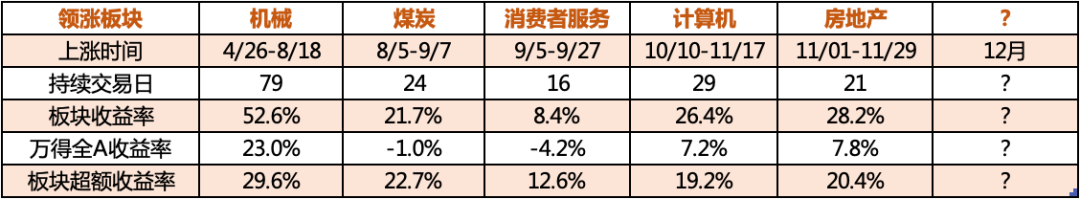 另外,从今年细分行业轮动的情况来看,除了煤炭和5-7月的赛道(汽车、新能源、机械、军工),是今年两个比较具有持续性的机会以外。其它阶段性领涨的板块,时长大多在20-30个交易日,超额收益大多在15%-20%,然后就会切换到下一个板块中。并且大多数板块的轮动,背后都有政策的引导。