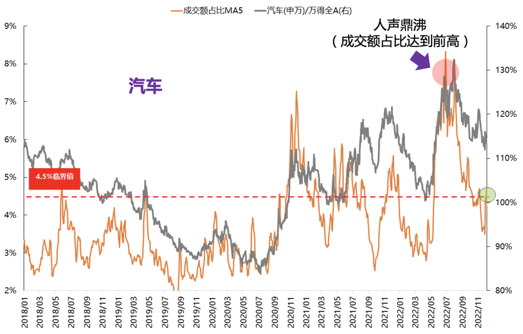 在上图的三个粉色圆圈中,分别标出的是新能源车、汽车、光伏三个板块在7月初的时候,成交额占比所达到的位置。