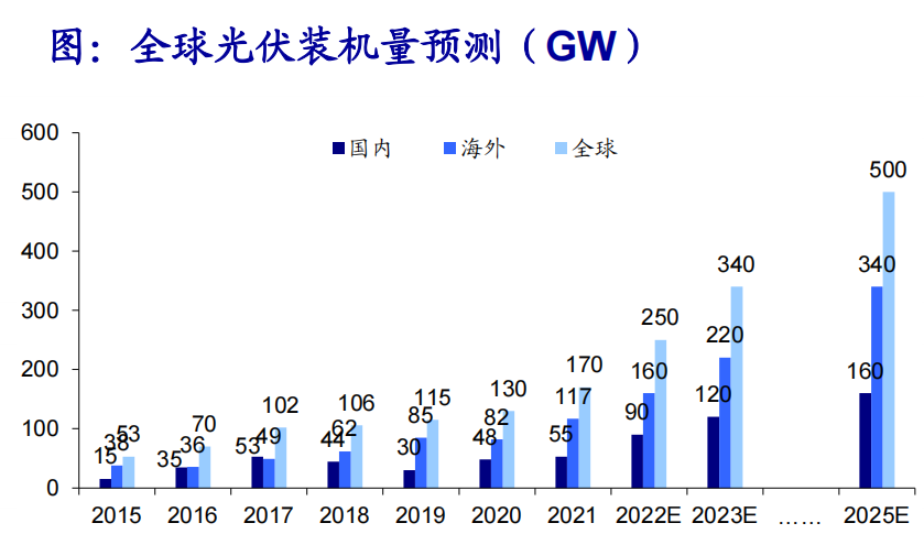 国际方面,其预计2022-2023年全球光伏新增装机容量将分别为250GW、340GW,到2025年全球光伏新增装机规模将有望达到500GW。
