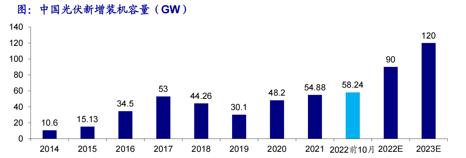 数据显示,2022年国内光伏需求增速喜人,根据CPIA数据,2022年前10月我国新增装机量为58.24GW,同比增长98.7%,前10月新增规模已超2021年全年规模。