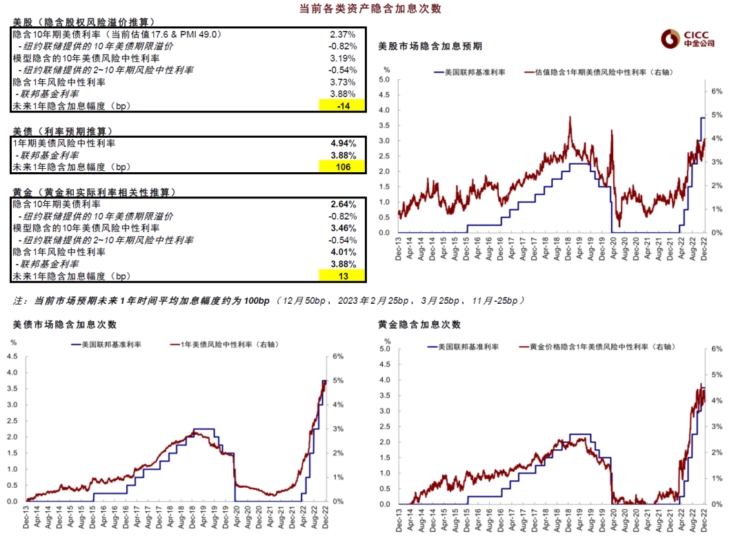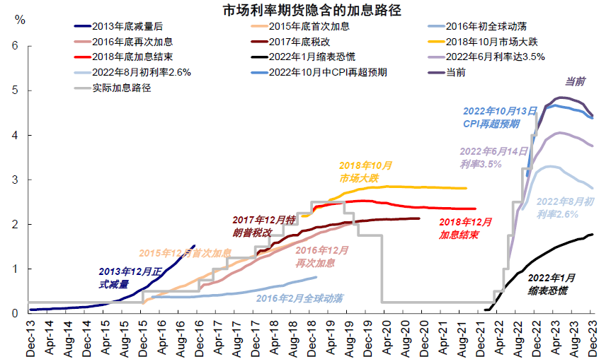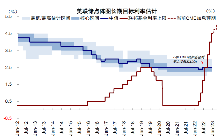 图表:在未来加息终点和持续时间上,基调都比当前市场预期加息终点可能下移同时2023年底有望降息的预期更加偏鹰