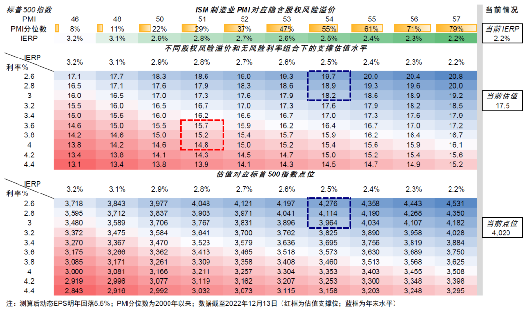 图表:不同股权风险溢价和无风险利率组合下的支撑估值水平