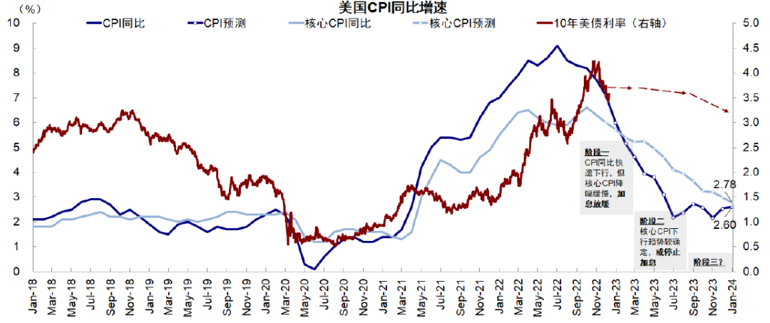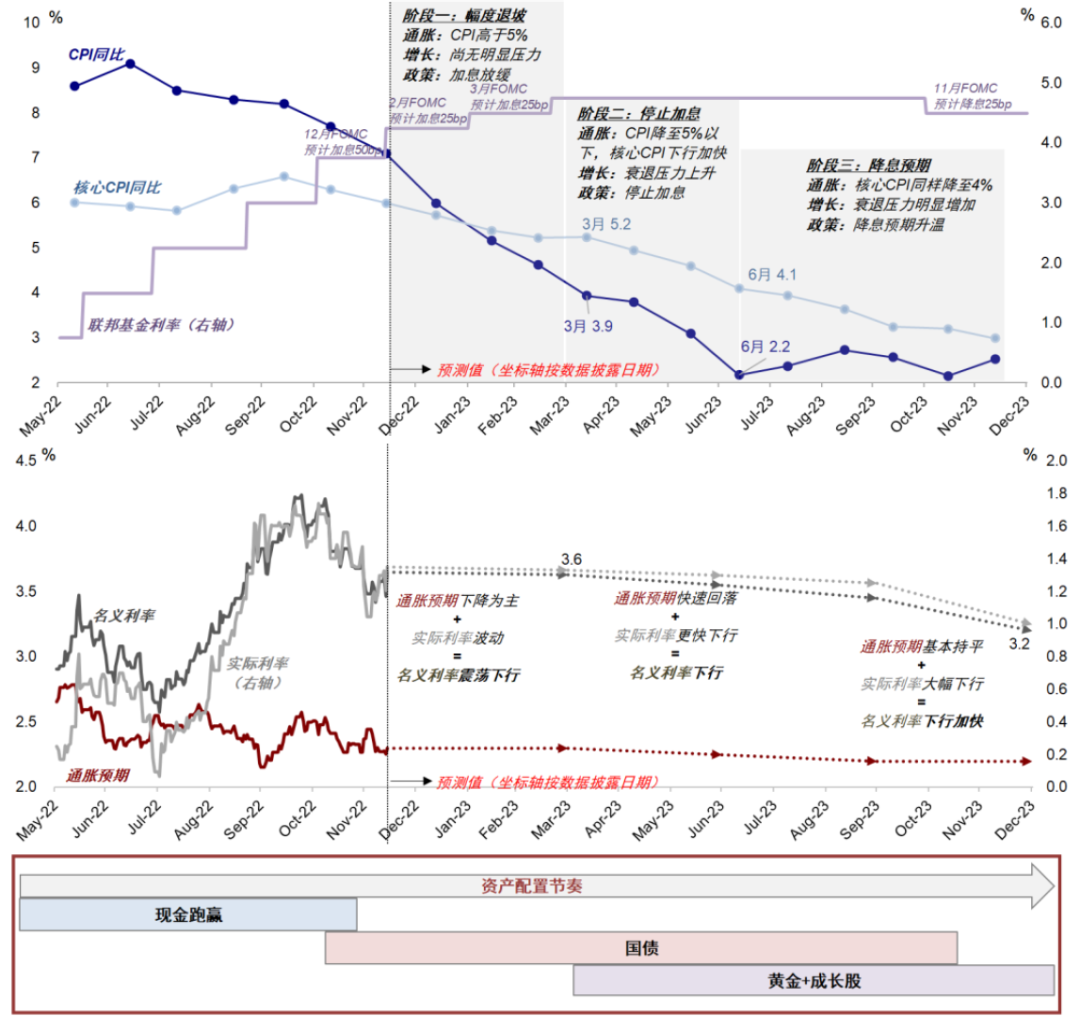 图表:我们预计政策的退坡和美债利率分三步走,在不同的水平还是只能做不同的事情,现在进入第二步,明年一季度通胀回落到5%左右,可以停止加息