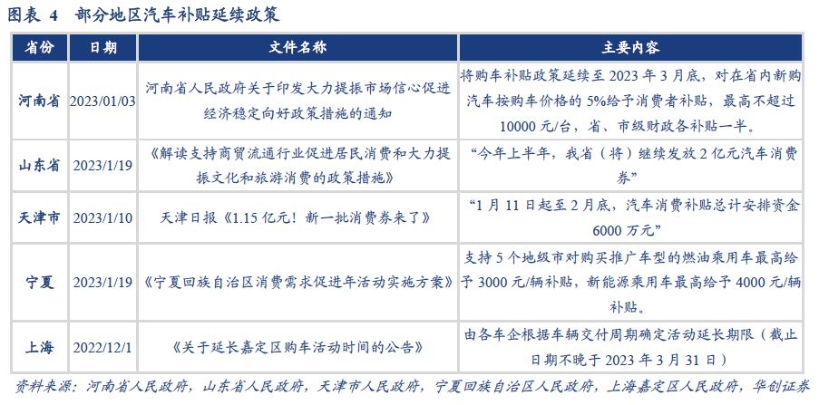 根据乘联会数据,1月截止至15日,汽车零售同比为-20.6%,大幅低于2022年12月的13.1%。1月,部分地区将去年的补贴政策予以延续。例如河南,将购车补贴政策延续至2023年3月底,对在省内新购汽车按购车价格的5%给予消费者补贴,最高不超过10000元/台,省、市级财政各补贴一半。