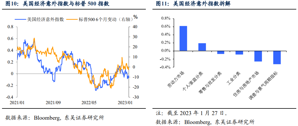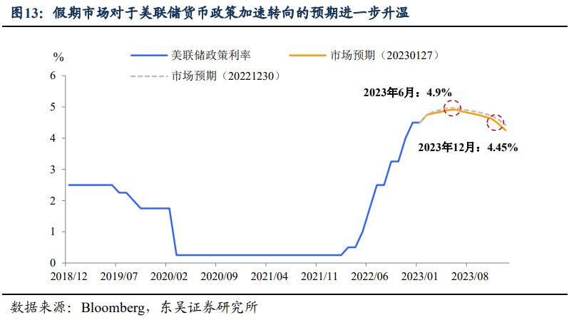 主线三:市场对于美联储货币政策加速转向似乎更有信心。尽管市场对于欧美主要经济体软着陆的预期升温,但是当下美国经济数据的表现并不如人意,2022年12月的PMI、零售销售等数据继续降温,叠加有着新美联储通讯社之称的Nick Timiraos的煽风点火——美联储将在2月进一步放缓加息至25bp,在春季讨论暂停加息,市场对于美联储转向的期望越来越高,如图11所示,截至1月27日,市场预计2023年内政策利率高点将出现在6月(4.9%),至年底这一水平则会下降至4.45%。