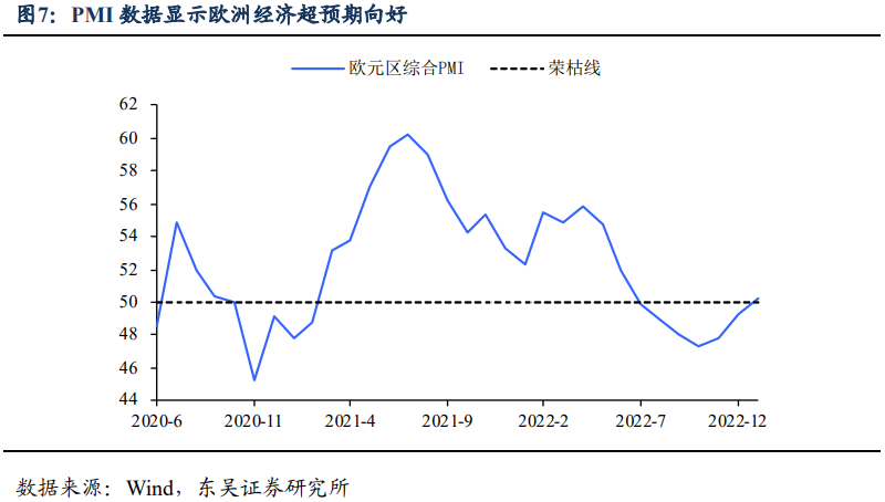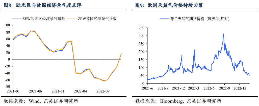 基本面上,至少在“软数据”方面欧洲经济出现了明显好转。2023年1月,欧元区综合PMI录得50.2,自2022年6月以来重返扩张区间(图7),欧元区与德国经济景气指数也明显反弹(2022年2月以来重新录得正值)(图8),可能更具信号意义的是假期德国政府也将2023年GDP增速由负值上修至0.2%。这背后除了强劲的就业市场、积极的财政政策外,能源价格(尤其是天然气)持续下降是重要的支持因素。