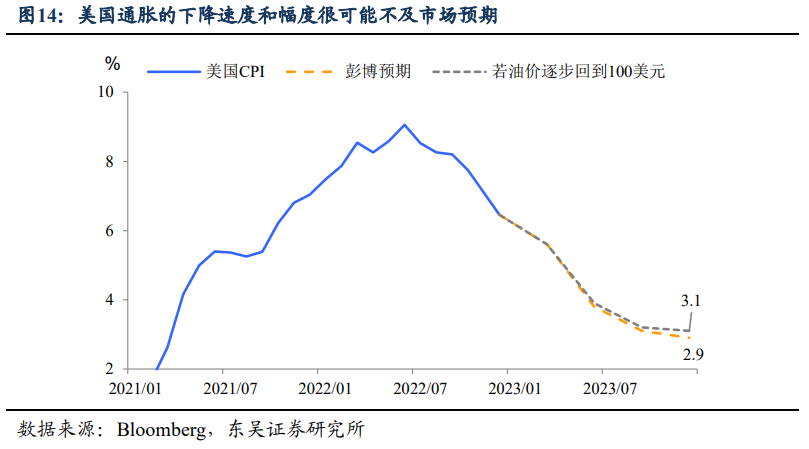 押注美联储加速转向的风险可能最大,除了我们上述说的三条主线不兼容的核心矛盾外,当前市场对于美国通胀加速下行的预期过于一致且偏乐观——2023Q3回到3%附近,2023Q4跌破3%。而我们在之前的报告中测算,不考虑美元贬值直接影响的情况下,油价若在中、欧需求的支撑下回到100美元/桶上方(这个可能性很大),美国通胀在2023年很难回到3%下方。