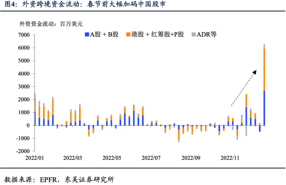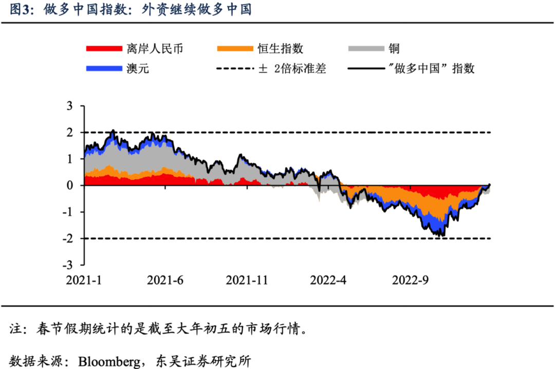 主线一:做多中国可能是当前海外市场最炙手可热的交易。从大类资产的表现来看,全球主要股指2023年以来涨幅前三中与中国相关的占据两席,商品中铜的表现无可撼动,汇率中澳元的涨幅也令其他主要货币相形见绌,我们在之前的报告中已经说明铜和澳元都是与中国经济息息相关的资产;从我们构造的指数来看,外资做多中国的情绪在突破中性区间后继续上涨;从跨境资本流动来看,外资增持中国权益资产的情绪在春节前后出现明显的高涨(图2至4)。