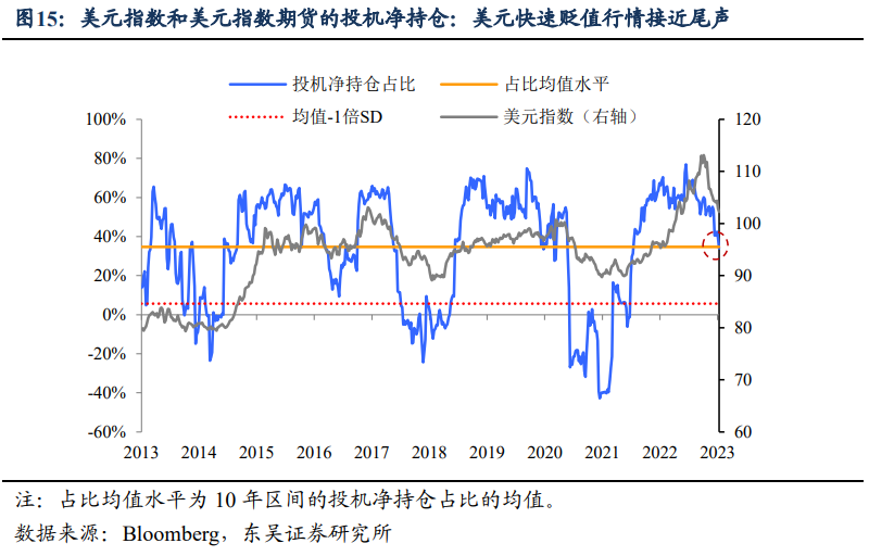 当前市场交易会以何种形式进入调整?关注美元和美债收益率的企稳反弹,时间窗口可能在2月中旬至3月,对于中国市场来说可能出现内外分化。我们预计2月2日美联储议息会议至2月14日公布1月美国CPI数据,将是美元和美债收益率阶段性企稳前最后的下跌窗口,基本面上,1月美国Markit PMI虽然继续位于枯荣线下方,但是输入价格分项自2022年5月份以来首次上升,这一边际变化值得关注,我们预计商品价格上涨和美元贬值的影响会逐步显现。市场交易层面,从美元指数期货持仓的情况来看,历史上每当投机净持仓占比回落到均值水平附近,美元指数的贬值速度将明显放缓,而当前美元正处于这个关口(图15)。此外,如果3月俄乌形势急转直下,将进一步助力美元指数反弹。