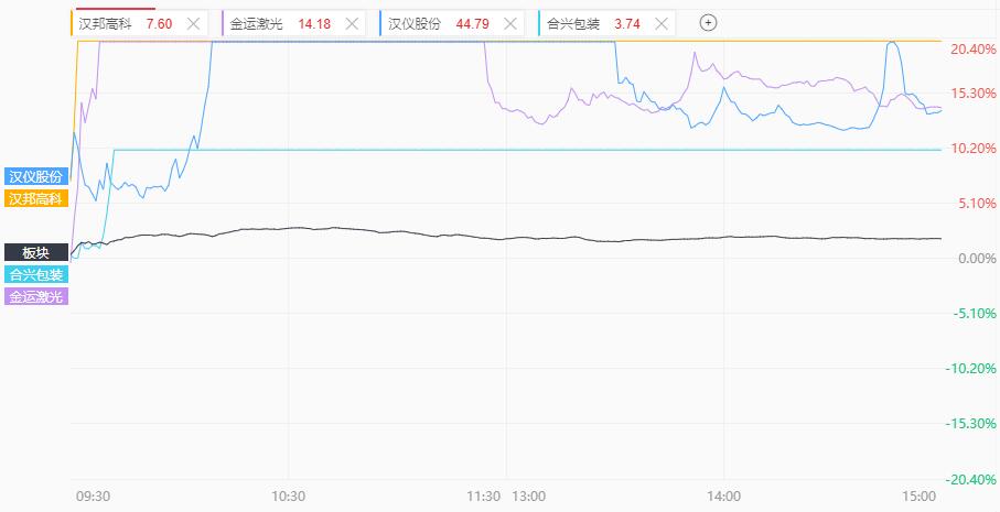 汉邦高科(20CM)、金运激光(20CM炸)、汉仪股份(20CM炸)、合兴包装早盘先后涨停;