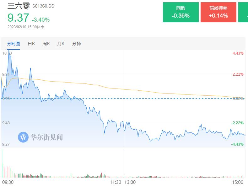 三连板的三六零,今日早盘一度冲高近5%,此后单边回落,最终弄收跌3.4%。