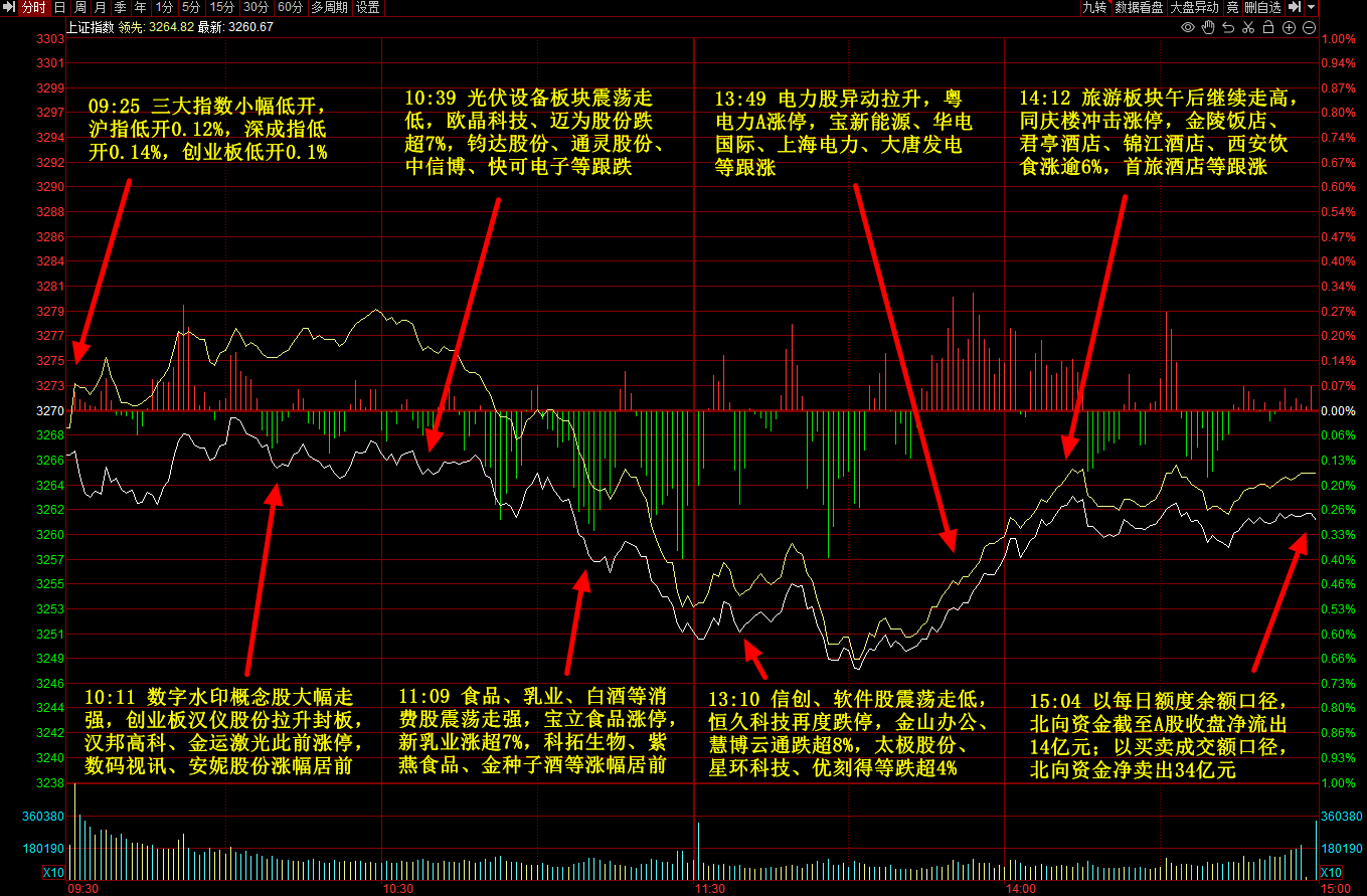 此外,餐饮、食品、电力等板块局部走强,有色、新能源、零部件等跌幅居前。