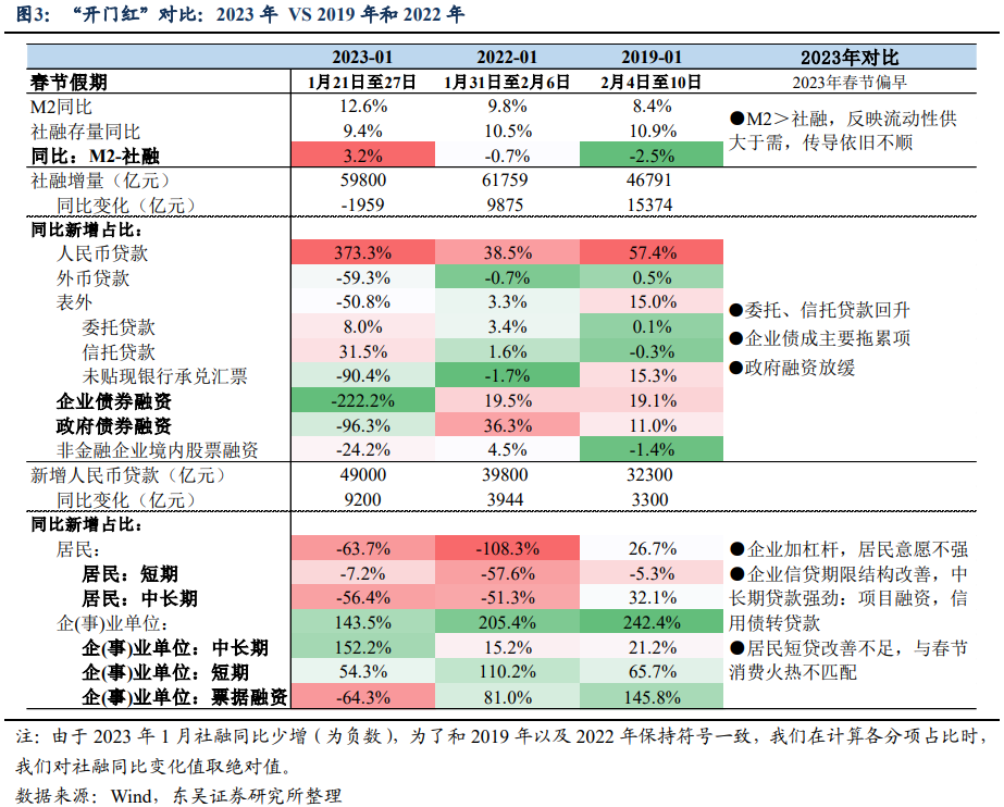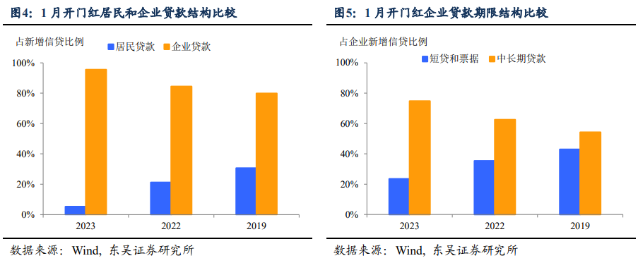 因此,“开门红”的质量更加重要,从结构上看,我们认为2023年要好于2022年,但是差于2019年:与2019年相比,2023年居民端的加杠杆意愿明显不足;与2022年相比,信贷通过短期工具冲量的情况明显缓解,具体而言: