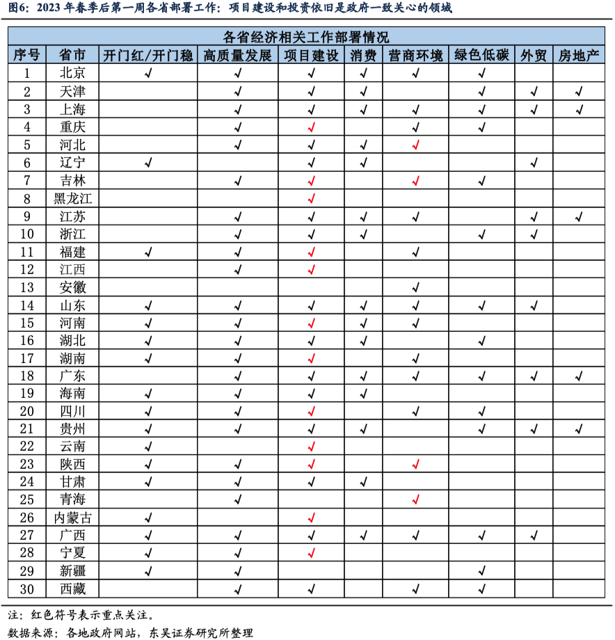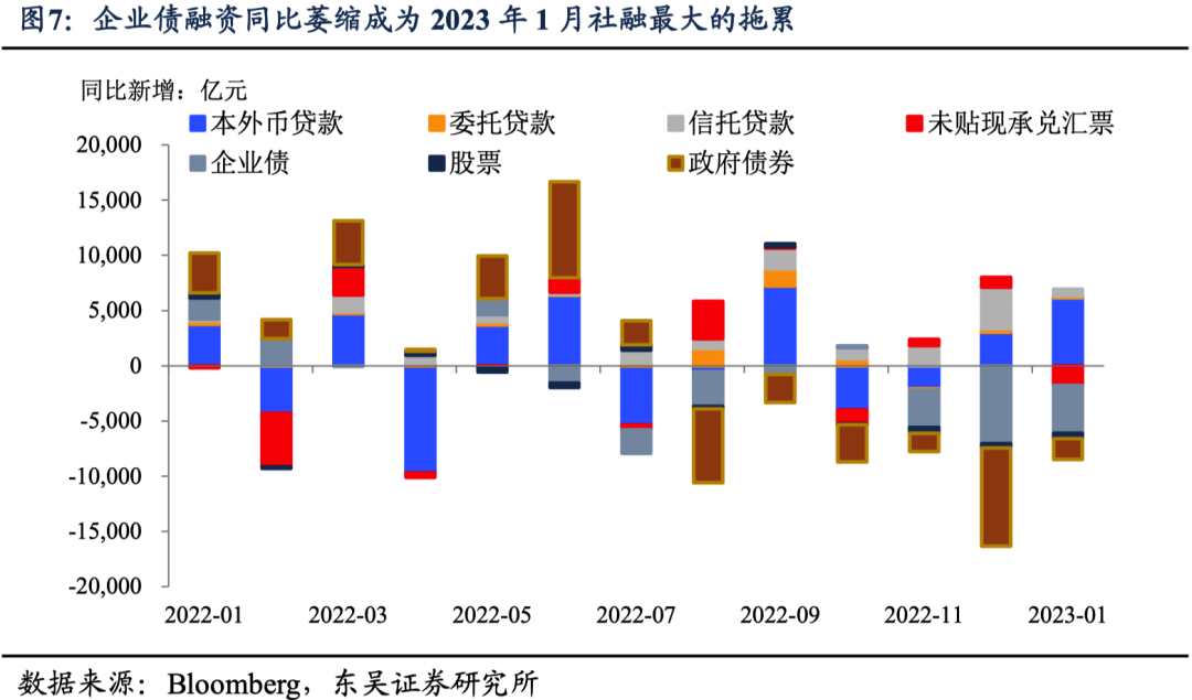 政府融资节奏有所放缓:弱于2022年。1月政府债券融资同比少1886亿元,不过这与2022年财政和基建明确要求提前发力有关。但是这并不意味着项目和投资的落地会相应的放缓,2022年下半年以来,政策性金融工具和商业银行贷款成为基建等项目融资越来越重要的来源,而由于地方收支压力和收益率要求的限制,专项债发挥的作用有所弱化。因此政府债券融资虽然放缓,但是政府资金撬动的杠杆却在放大,这将支持第一季度投资增速继续保持强劲。