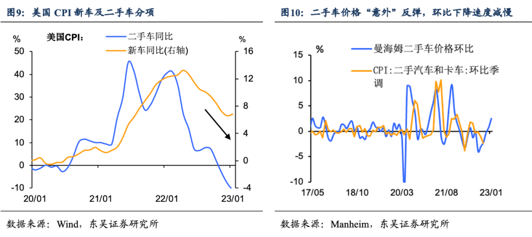 三是二手车价格上涨重返市场,增加通胀压力。此前核心商品下行的作用力受二手汽车和卡车价格的放缓驱动。然而1月份二手车价格的“意外惊喜”给二手车通胀继续下行带来一定的阻力,通胀上行风险加大(图9、10)。