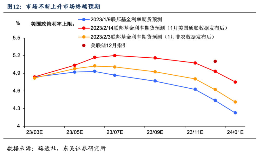 为浇灭通胀萌芽,加息将延续到5月。基于1月强劲的通胀及就业数据,浇灭了美联储短期内暂停加息的希望,后续有更多空间收紧金融条件。市场虽在公布1月非农数据及2月议息会议后市场对于加息路径的预测进行了调整,但在美联储看来仍较为乐观。3月加息25bp不是终点,加息至少将持续至5月,而这意味着年内利率峰值的区间不会低于5%-5.25%(图12)。